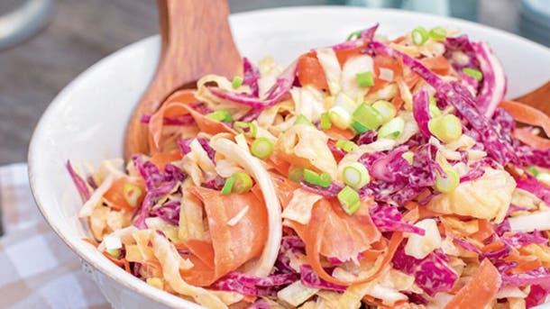 The epitome of a summer side dish and great for feeding a large, hungry crowd, this cole slaw goes perfectly with a variety of smoked meats.