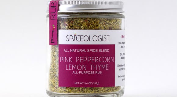 Spiceologist Pink Peppercorn Lemon Thyme Rub dresses up corn, fish, beef, chicken and vegetables with its intensely flavorful blend of spices including lemon peel powder, ground black pepper, whole pink peppercorns, dried thyme and kosher salt. This zesty and citrusy rub is ideal for barbecue season, and is free of artificial ingredients and MSG.