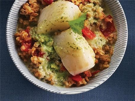 Brown rice is the base for this hearty stew, topped with tender whitefish and a drizzle of cilantro-infused coconut milk.
