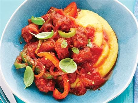 Set aside 15 minutes to whip up a dish that’s a definite crowd-pleaser: a saucy mix of tomato, turkey sausage and peppers on creamy polenta!