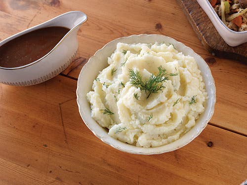 Mashed potatoes are a wonderfully blank canvas that can be enhanced by adding other vegetables to the cooking water. Here, cauliflower adds nutty notes while dill stirred in at the end adds lovely green flecks and a pop of fresh flavor.