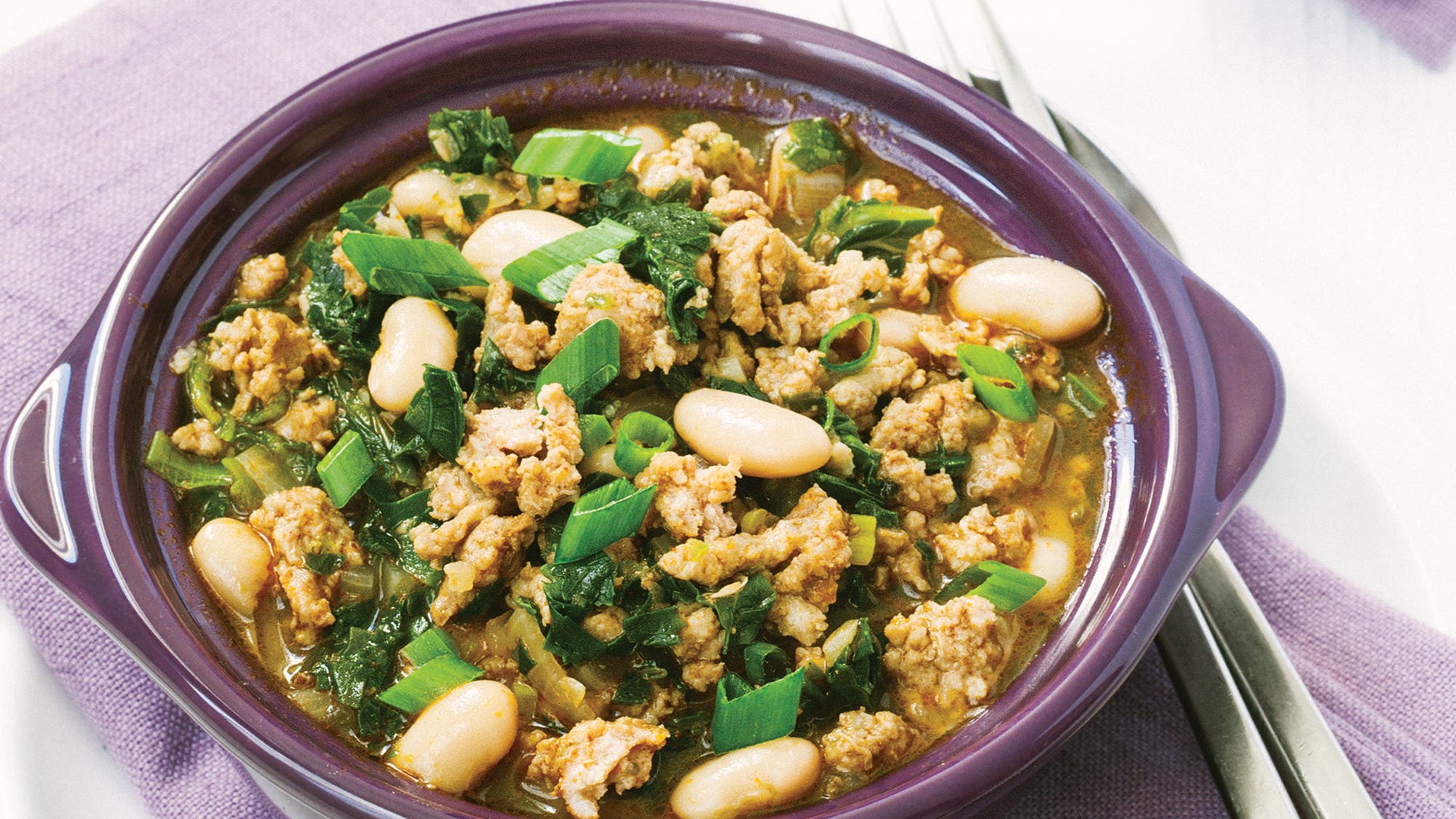This lighter take on chili is made without tomatoes, leaving room for fiber-rich greens. We’ve kept the spices mild to please many palates, but you can easily add more chile powder if you prefer a spicier dish – here at the CE office, we love this meal smothered in hot sauce!