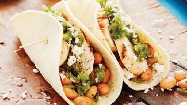 This tomatillo salsa with lime juice and cumin does double duty as both a topper over the tacos as well as a sauce to simmer the beans in for maximum flavor.