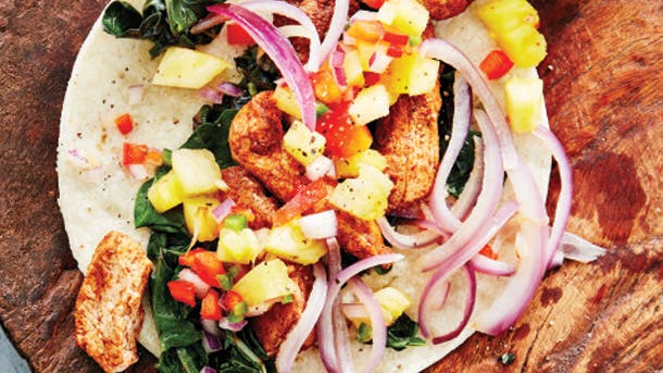 This jalapeño-spiked pineapple salsa has it all – sweet, spicy and tangy notes – all of which brighten up these juicy pork tenderloin tacos with sautéed greens.