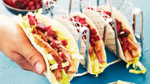 Red beet and chile pepper salsa makes for a striking and flavorful topper on these oregano and sriracha–marinated steak tacos. Because this salsa requires a little baking time to cook the beet, you can make it entirely up to 1 day in advance and refrigerate until serving.
