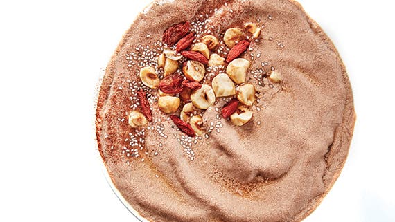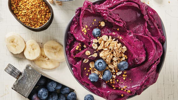 The smoothie bowl craze started to take off with acai bowls, a soft-serve-like blend of frozen acai and other fruits like bananas or strawberries, plus enough juice to get the blender going. Acai bowls are traditionally covered in granola, fresh fruit and perhaps a drizzle of honey, providing a delicious contrast in texture to the smooth purée.