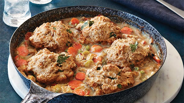 Trust us, this isn’t your grandmother’s turkey pot pie! Our easy version is made from start to finish in the same skillet, making cleanup a breeze – plus, our fluffy biscuits are a nice change-up to the traditional pastry topping. If you have green beans leftover from your holiday meal, you can use them instead of the peas.
