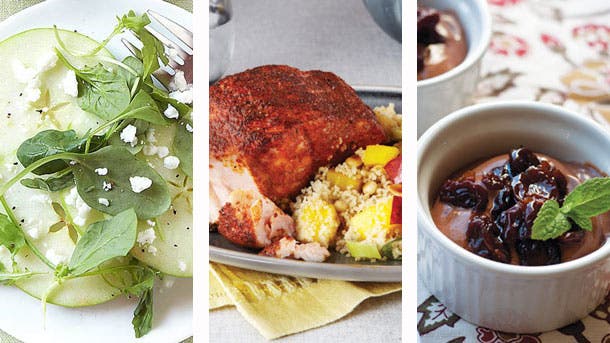 Let your tastebuds do the talking thanks to the fruity and exotic flavors in this menu. Begin with a fresh take on the traditional salad by introducing a sweet-tart green apple and goat cheese carpaccio that only takes 15 minutes to make. Packed with B12, the Moroccan Salmon is pan-seared with cumin, paprika, and cardamom for a lovely hit of spice. Prepare the tangy Greek yogurt mousse first to allow plenty of time for your dessert to chill.