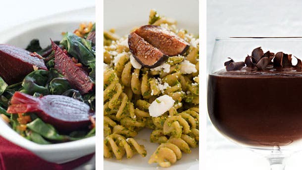 For vegetarians looking for a filling and flavored meal, a beet salad, pesto pasta, and Dark Chocolate Pudding will set the mood. Protein-packed beet greens are equally nutritious and quick to make. The nutty pistachios and fig pasta make a big statement and a homemade pesto sauce will bring out the bold, intense flavors of the dish. The chocolate pudding only takes 15 minutes to whip up but will need an hour to chill, so prepare ahead of time.