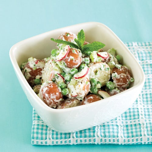 In a separate large bowl, toss potatoes, celery, radishes and dressing. Add peas and mint last to avoid bruising, and coat evenly. Serve.