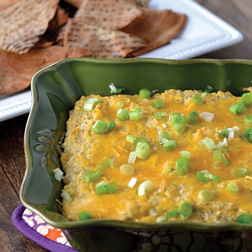 Preheat oven to 350°F. With 2 forks, finely shred chicken in an 8-inch square baking dish. Pour cheese mixture over top. Add blue cheese and mix well. Sprinkle with remaining 1/4 cup cheddar and bake until bubbly, 20 to 25 minutes. Sprinkle with scallions and serve with whole-grain chips or sliced vegetables.