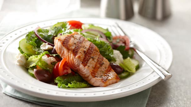 Make this salad with Wild Alaska Salmon to reap all of the health benefits associated with the omega-3 rich fish. The pitted Kalamata olives complement the creamy feta cheese.