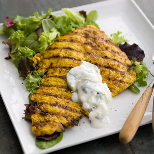 Curtis Stone's Middle Eastern style grilled chicken lunch will satisfy all of your taste buds. The spice rub seasoning gives the chicken a hot flavor, and the cooling yogurt topping sauce is made with real cucumbers.