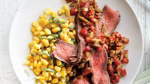 Olives, roasted red peppers and tomatoes combine for a flavorful condiment to this juicy steak.