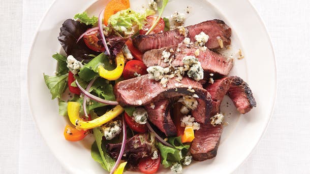 This satisfying salad is a quick dinner recipe with a delicious combination of crisp veggies, juicy steak and pungent blue cheese.