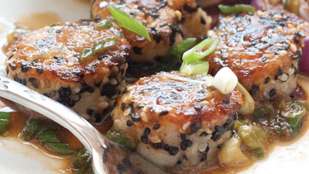 A white-and-black duo of sesame seeds provide a dramatic color contrast, not to mention added flavor and crunch, to these Asian-inspired scallops.
