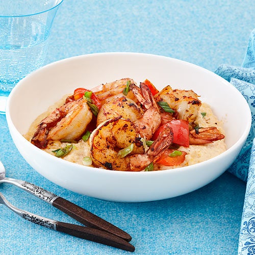So as not to stifle the nutrients in shrimp and grits, we've cut the butter and cheese so often laced throughout, cutting cholesterol in the process and adding ample iron and vitamins A and C.