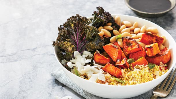 A zesty ginger-lime vinaigrette sweetened with maple syrup brings the savory flavors of sweet potato and kale together with the tropical taste of coconut.