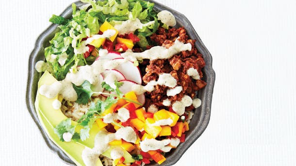 We’re bringing back the taco bowl with this meatless take on the classic. Tempeh, made from fermented soybeans, has a nutty, mushroom-like taste and is one of our favorite vegetarian substitutes for ground beef. We’ve even cracked the code on a dairy-free chile cheese sauce – who knew hemp, nutritional yeast and chile could taste so good together?
