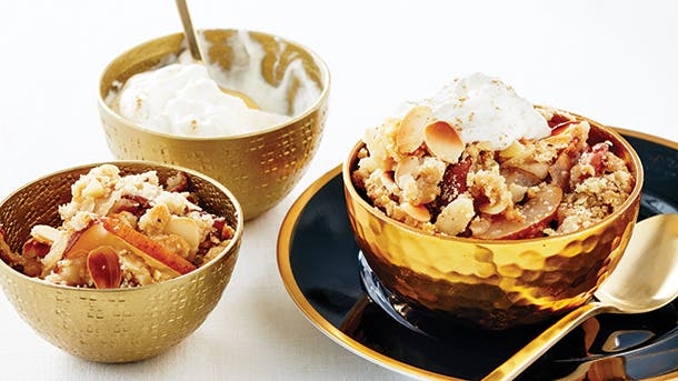The humble crumble gets dressed up for the holidays with almonds and almond extract in the topping and a touch of cardamom in the whipped cream. Look for pears that are ripe but not overly so – they should be tender at the stem, but not mushy.
