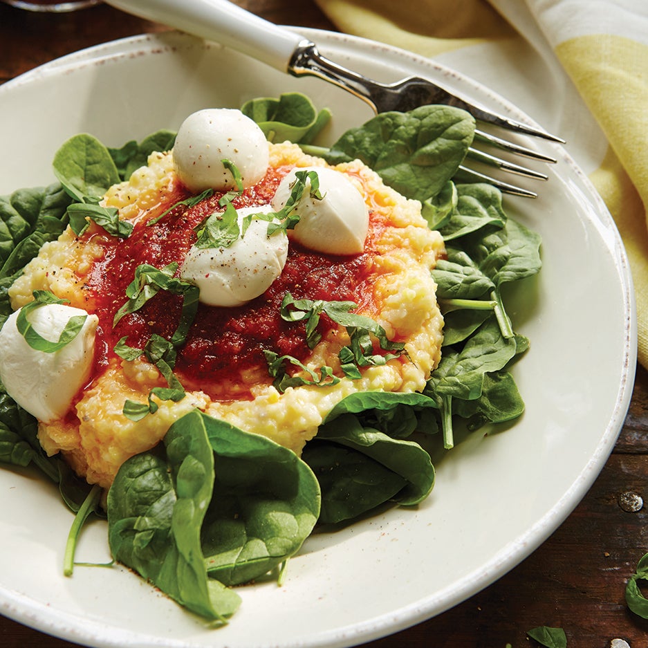 To serve, divide spinach between 4 bowls and top with polenta. Measure ¼ cup of spaghetti sauce over each bowl and top with mozzarella. The mozzarella should soften in the hot sauce. Top with basil.