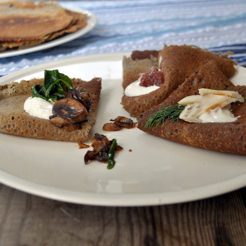 I often find I don’t need to use a spatula to flip the pancakes. You can tell when they are done cooking on the first side because the edges will begin to dry and curl toward you, at which point they can be picked up by hand and flipped. The key to this maneuver is a well-seasoned cast iron skillet. More experienced blini-makers than I are able to flip the pan itself. By all means, do use a butter knife or a spatula if you want something between you and hot iron.