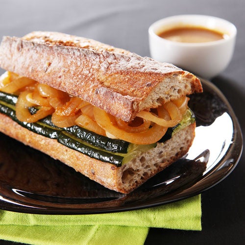 Remove zucchini and rolls from oven. Divide zucchini among 4 rolls. Using tongs, pull caramelized onions out of jus and divide among 4 sandwiches. Ladle about 1/2 cup jus into 4 small bowls and serve hot with each sandwich for dipping.