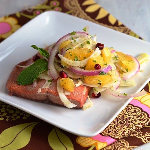 The tangy flavors of pomegranate, honey and allspice combine to poach our lemon-tinged salmon, leaving a flaky, thoroughly flavored flesh complemented by a crisp, citrus-fennel side salad.
