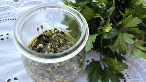 Years ago, a friend told me the story of her Italian grandmother, who had heart disease. Her doctor prescribed that she eat a traditional dip that she loved, heavy in parsley and garlic, anchovy and lemon. The name of the dish is lost to me now, but it is full of superfoods. This is my recreation of that dip. It’s rich in antioxidants, minerals and vitamins from the parsley, antimicrobial compounds from the garlic and lemon, and high in Omega 3 fatty acids from the anchovies. Stir it into vegetables, scoop it onto crudité or crackers, or use a dollop atop meats.