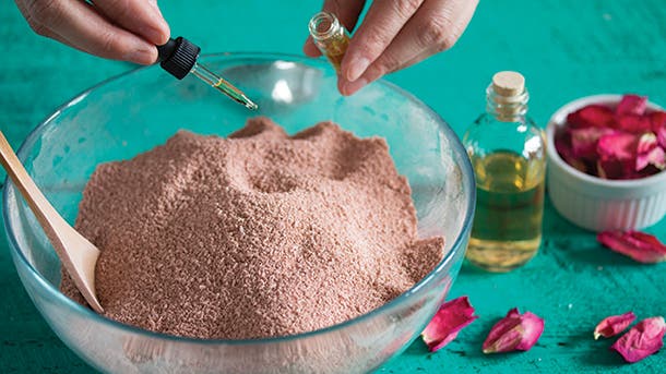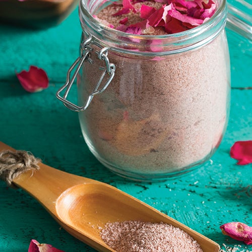 Step 4: Transfer bath soak to an airtight container or jar, layering in crushed or whole rose petals (if using). To take an aromatherapy bath, add ½ cup of mixture to bath water. Soak for 20 minutes.