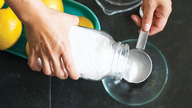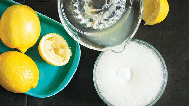 2. Pour lemon juice over baking soda. It will begin to foam immediately.