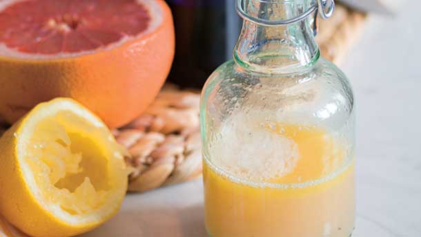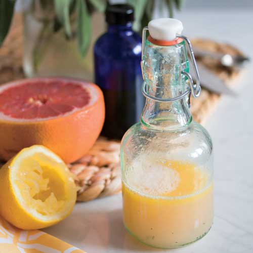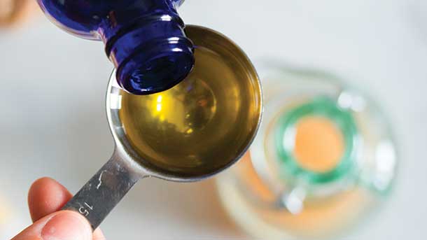 2. Into a small bottle, pour juices and oil. (TIP: Use a salad dressing or oil bottle with a small spout for easy application to your scalp.)