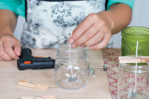 2. Position a clothespin horizontally across each jar to hold wicks in place.