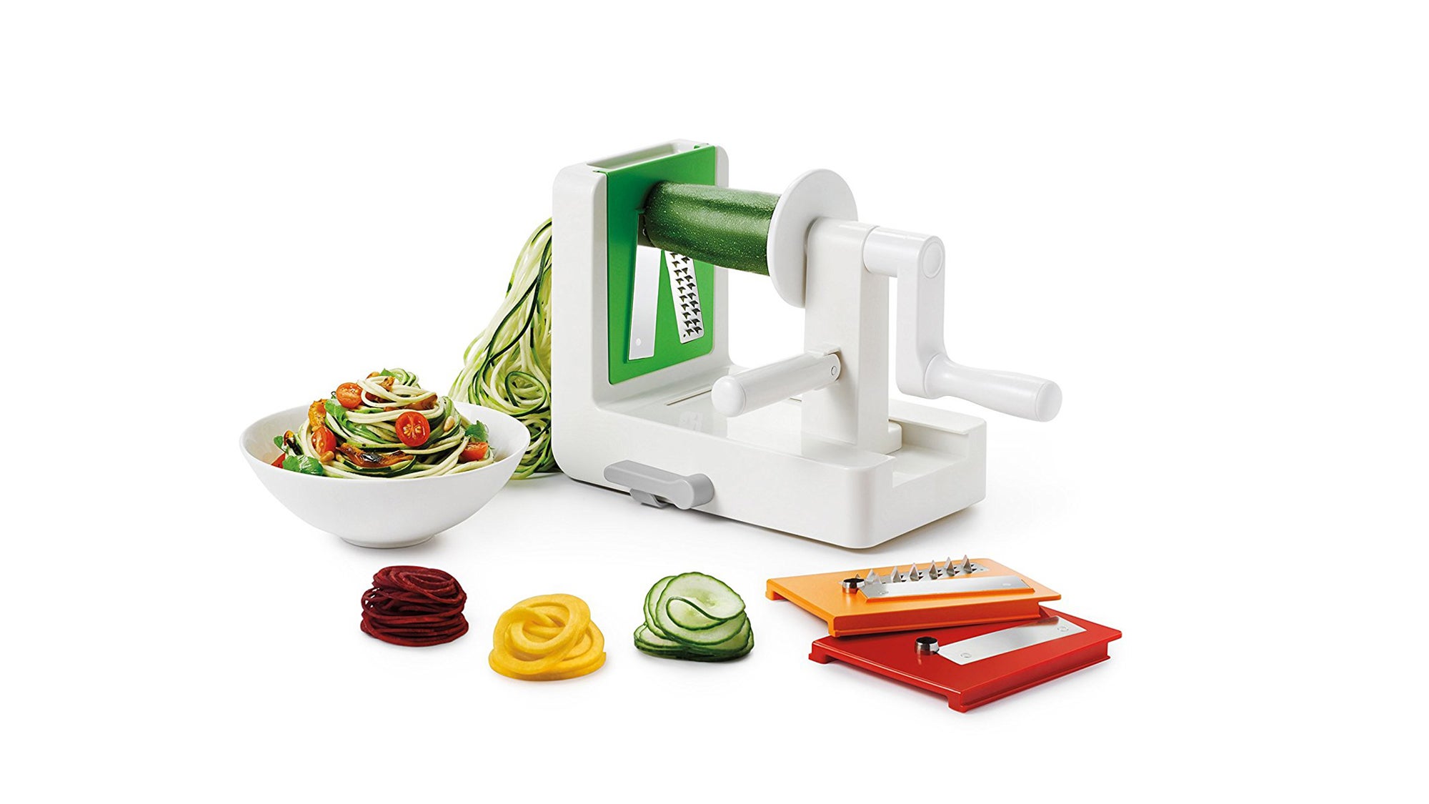 This Japanese model is a workhorse – ideal for those who spiralize often. There is a learning curve in getting the hang of switching between the three blades (you have to turn a knob to get the blade out), but it’s worth learning as it quickly and smoothly turns your veggies into noodles. We also love that it comes in a pretty light green color!