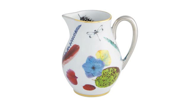 This gorgeous porcelain Christian Lacroix Caribe Milk Jug by Vista Alegre holds up to 13 ounces of milk. Its tropically chic design of ferns, flowers, feathers and fireflies was inspired by the English embroidery that once adorned the petticoats of women living in Salvador da Bahia, Brazil.
