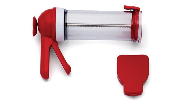 The Chef’n Cookie Machine Cookie Press includes 10 stainless steel disks for baking holiday-themed spritz cookies. Simply place the dough inside the machine and use the lever to push it out through the disks onto a baking sheet.