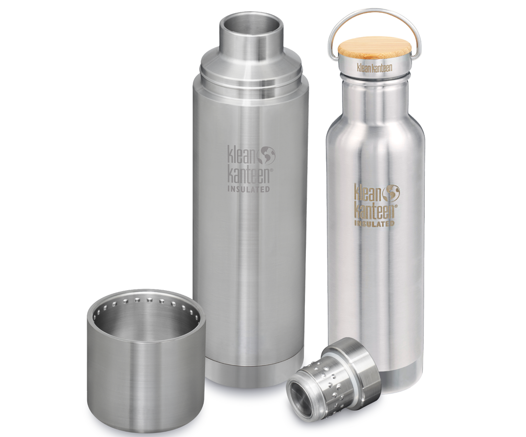 The Kit comes with an Insulated TKPro 32oz double-walled thermos with 360-degree pour-through lid and a utilitarian cap that doubles as a cup, as well as a matching Classic Insulated Reflect 20oz bottle, updated with an etched logo and a bamboo cap.