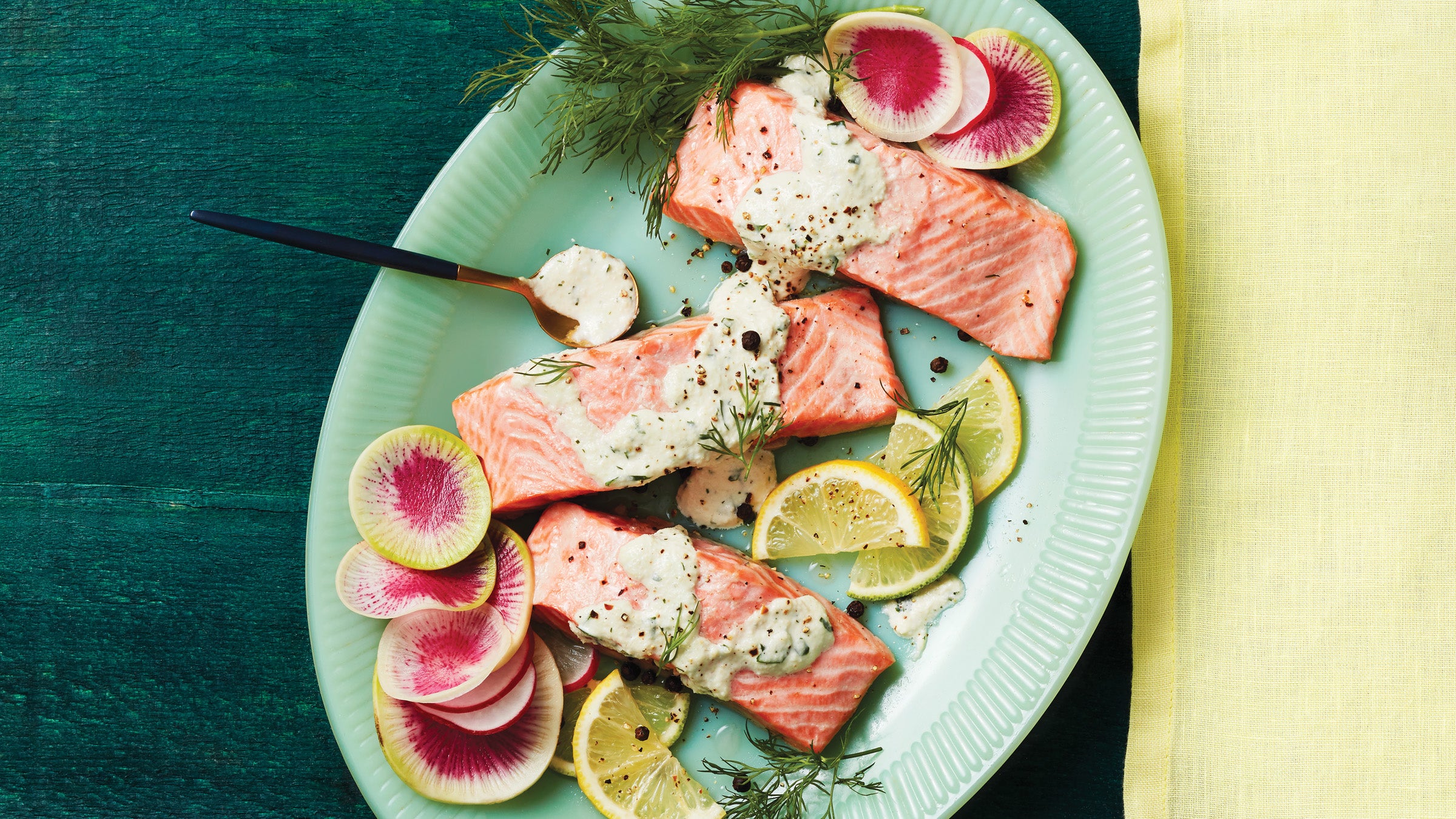 Zesty lemons and limes lend bright flavor to salmon fillets, which then get topped in a creamy herb sauce with dill, parsley and mint. Get the recipe.