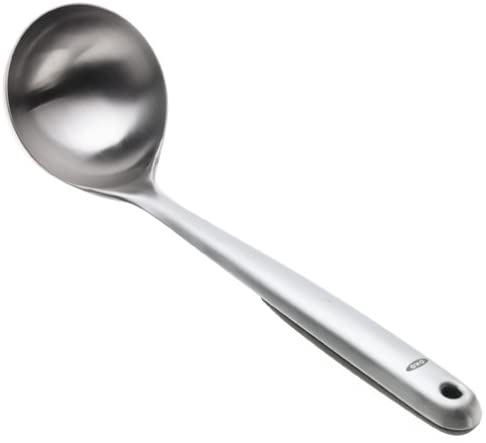 Sturdy Stainless Steel. This brushed stainless steel ladle comes with a cushioned, non-slip grip on the back of the handle for comfort and ease of use.