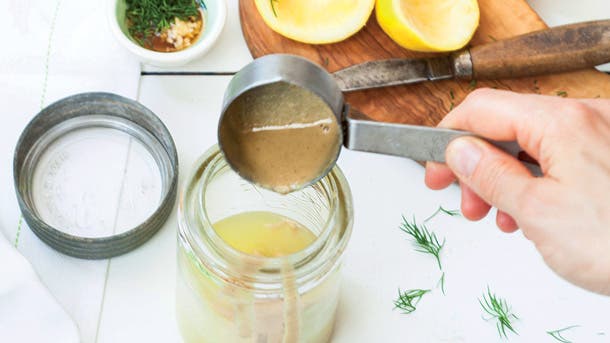 To mix the dressing, just give the jar a vigorous shake. As a general rule of thumb, when creating your own dressing, you will want to include an acid, a fat, an emulsifier and flavor enhancers.