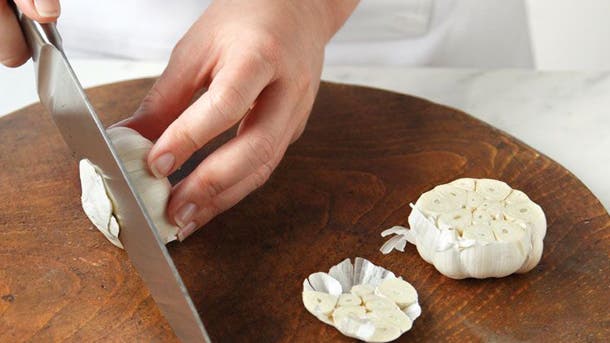 3. With a kitchen knife, cut a 1/4 to 1/2 inch off the head, exposing the cloves.